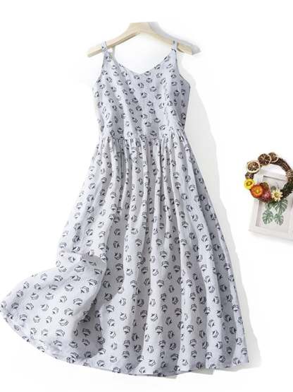 Cotton And Linen Commuting Artistic Printed Suspender Dress