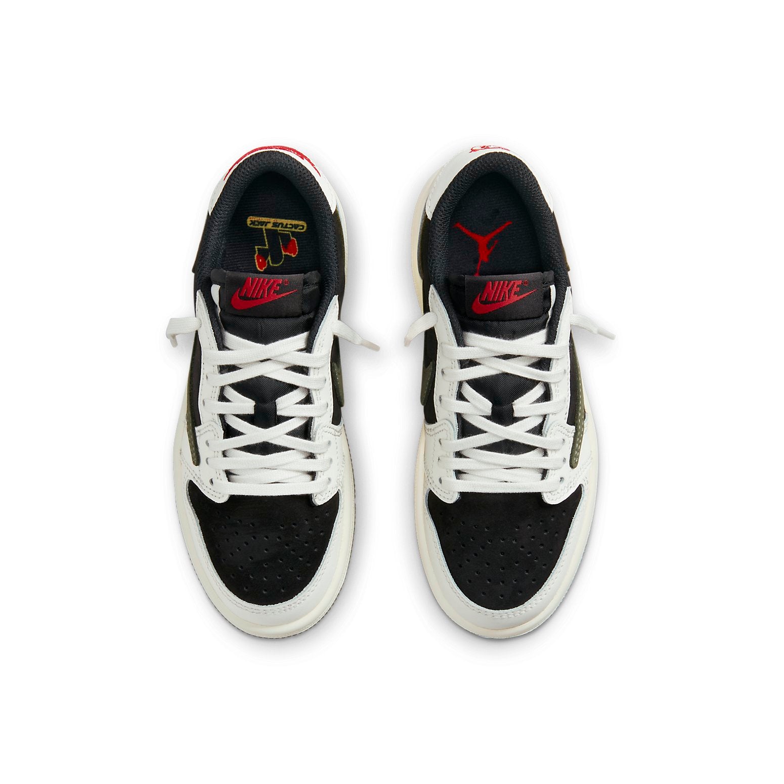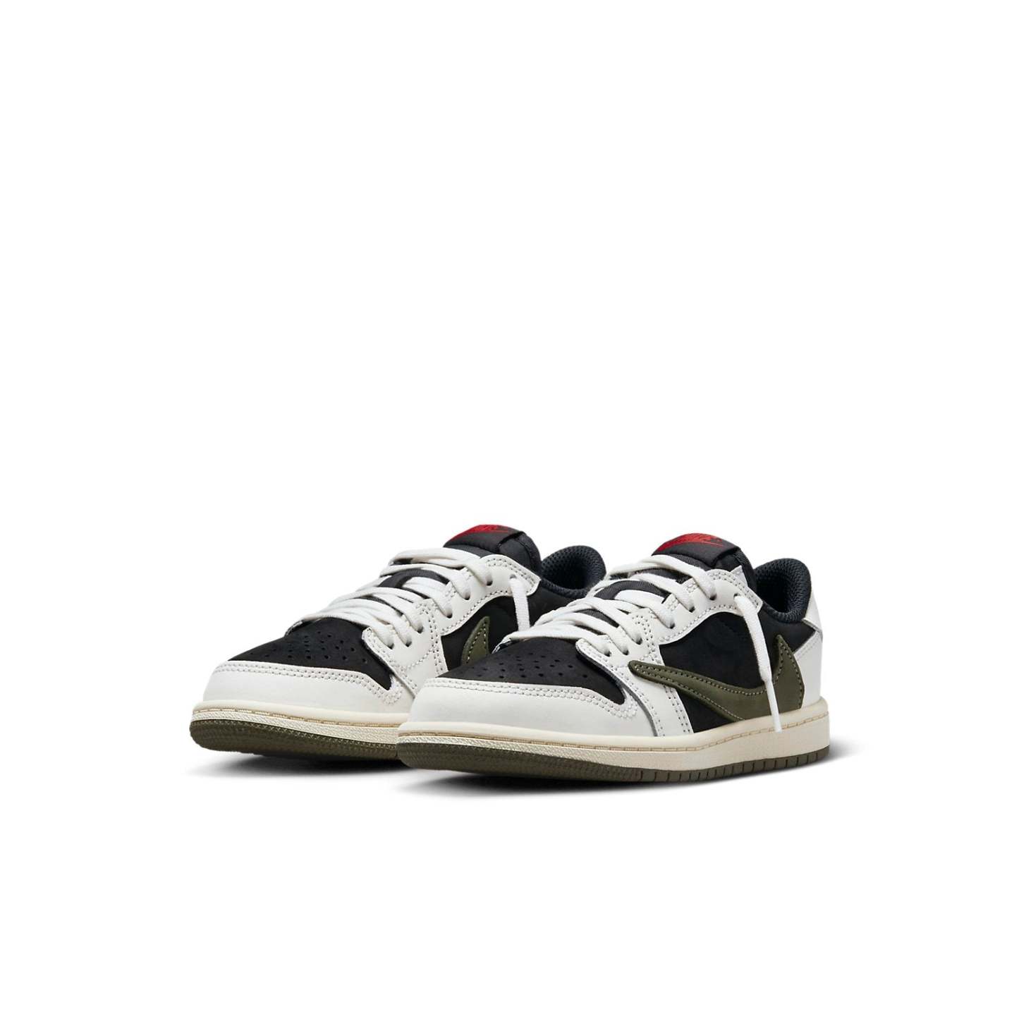 The Air Jordan 1 Retro Low OG SP 'Travis Scott Olive' is a stylish and iconic sneaker. It features a large reverse Swoosh logo and an olive green tone, with a white leather and black suede upper. Hits of red on the tongue label, Jumpman insole logo, and Travis Scott badge on the heel, with cactus-inspired patches on the insole. The midsole is finished with a light canvas/yellow hue, and the deep olive green outsole adds a touch of design. Perfect for everyday wear or a night out, this sneaker is inspired by the iconic Jordan series and is sure to make a statement.